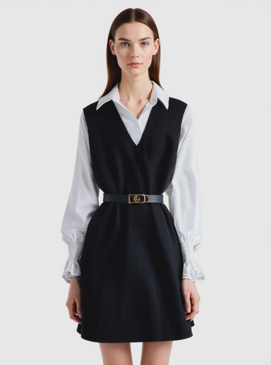 Minimalist, portrait style, female model, fair skin with cool undertones, detailed skin texture, neutral expression, chestnut brown hair styled elegantly, straight texture, high cheekbones, and a defined jawline. Front-facing pose, arms relaxed at sides, legs straight, head facing forward. Wearing (white shirt, classic button-up, crisp fabric, regular fit), (black vest, tailored, structured, V-neckline), (wide black belt, cinched at waist, leather texture, silver buckle). Clean studio background, crisp lighting, high contrast, sharp focus. Shot on Canon R5, Vogue photoshoot, unedited, raw, DSC_02.jpg, National Geographic, 2019 / Nikon D3400, 50mm, f/2.8.