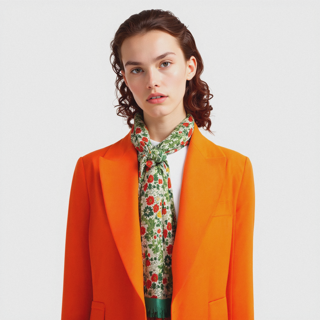 Minimalist, portrait style, Western European female model with chestnut brown curly hair styled elegantly, high cheekbones, and a defined jawline, fair skin with cool undertones. Head slightly tilted, arms straight down, neutral expression. Wearing (vibrant orange jacket, structured fit, collar open), (lightweight floral scarf, loosely draped around the neck). Plain studio background, crisp lighting, high contrast, focus on facial features and upper garment styling. Detailed skin texture, shot on Canon R5, Vogue photoshoot, unedited, raw, DSC_02.jpg, National Geographic, 2019 / Nikon D3400, 50mm, f/2.8.