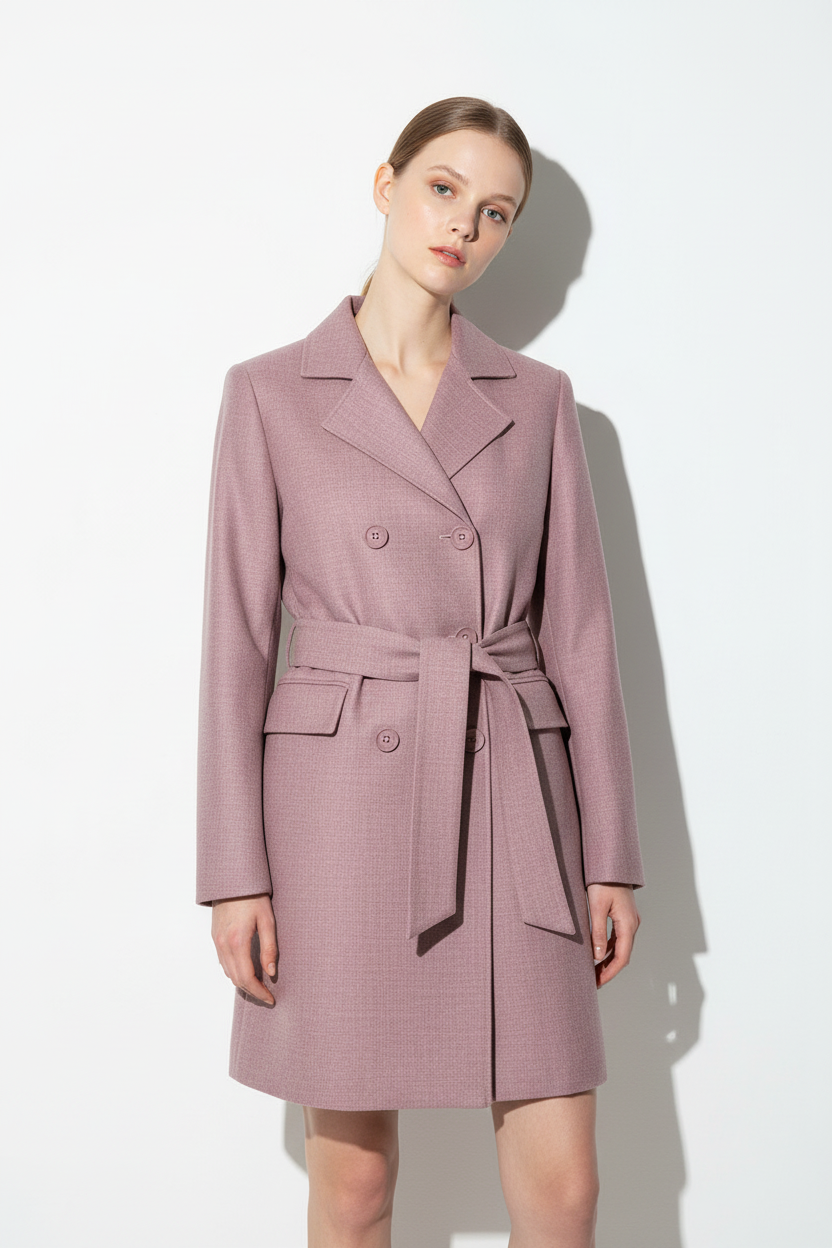 Minimalist, portrait style, adult female model, fair skin, head slightly tilted, arms straight down, slender build, detailed skin texture. Wearing (pink belted double-breasted coat, textured wool fabric, structured shoulders, wide notched lapels, double row of buttons, self-tie belt at waist). Invisible mannequin style, plain white studio background, front light, high contrast. Sharp focus on fabric texture and design details of the coat. Shot on Canon R5, Vogue photoshoot, unedited, raw, DSC_02.jpg, National Geographic, 2019 / Nikon D3400, 50mm, f/2.8.