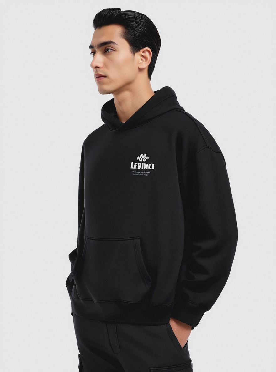 Minimalist, studio shot, full-body view. A man between 22-28 years old, Middle Eastern male model with deep, expressive almond-shaped eyes, thick, well-defined eyebrows, high cheekbones, and a strong yet elegant jawline. Hair is dark, rich, and sleek. Standing in a relaxed left side view, head turned left, arms relaxed by sides, legs straight. Wearing (black hoodie, white logo printed on chest, relaxed fit), (black tapered cargo pants, minimal design), (white low-top sneakers, clean style). Plain white studio background, simple and modern aesthetic, sharp focus. Detailed skin texture, shot on Canon R5, Vogue photoshoot, unedited, raw, DSC_02.jpg, National Geographic, 2019 / Nikon D3400, 50mm, f/2.8.