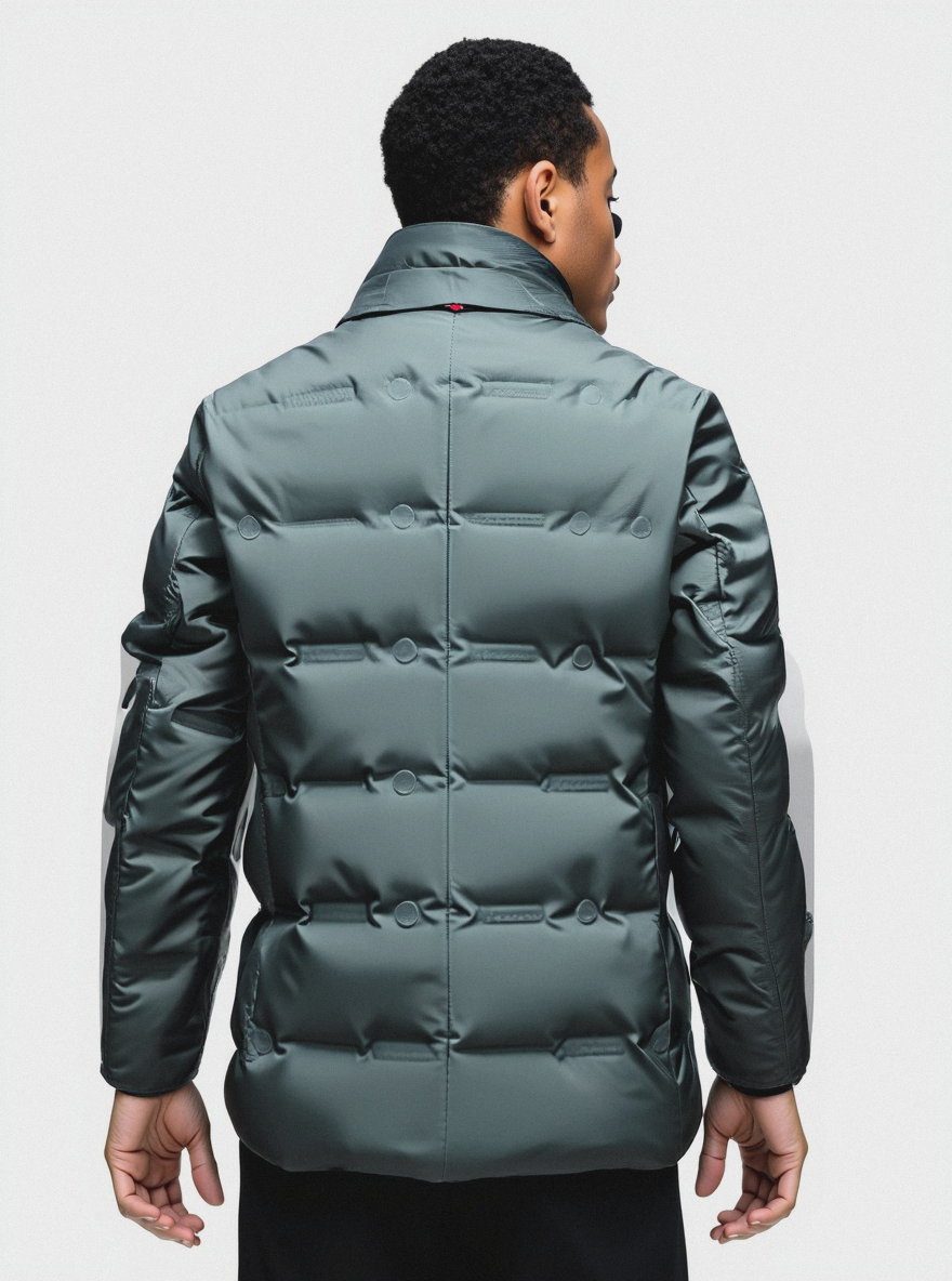 Minimalist, studio photoshoot, back view. Adult male model, African American, standing straight with arms relaxed and legs straight, head turned slightly to the right. Wearing (dark green padded winter jacket, thick insulation, high collar, quilted texture, hip-length, matte finish). Shot in a plain white studio background, clean and distraction-free setting. Detailed skin texture visible on the neck and hands. Shot on Canon R5, Vogue photoshoot, unedited, raw, DSC_02.jpg, National Geographic, 2019 / Nikon D3400, 50mm, f/2.8.