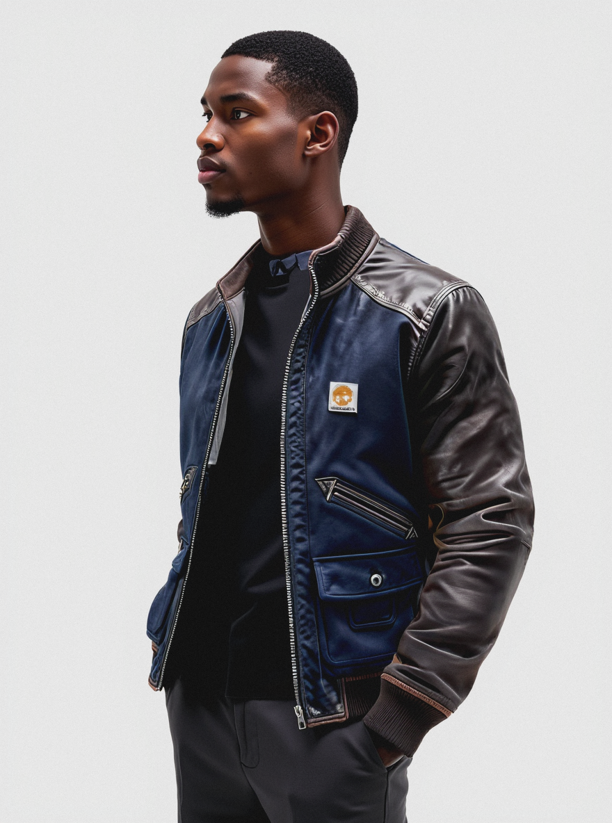 Minimalist, portrait style, African American male model, rich deep brown skin tone with detailed skin texture, glowing with warmth and radiance, high cheekbones, full lips, well-defined jawline. Pose: left side view, head turned left, arms relaxed at sides, legs straight. Wearing (leather-sleeved navy bomber jacket, regular fit, zip-up front, ribbed collar and cuffs). Studio background, clean white setting, crisp lighting, high contrast, sharp focus on facial features and garment texture. Shot on Canon R5, Vogue photoshoot, unedited, raw, DSC_02.jpg, National Geographic, 2019 / Nikon D3400, 50mm, f/2.8.