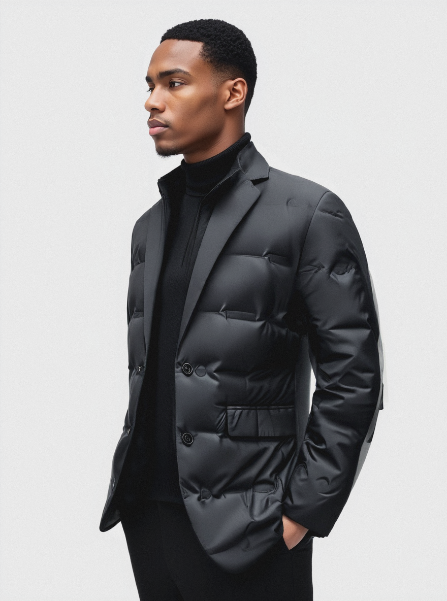 Minimalist studio shot, adult African American male model with rich, deep brown skin tone, detailed skin texture, glowing with warmth and radiance, high cheekbones, full lips, and a well-defined jawline. Posed in a left side view, head turned left, arms relaxed at sides, legs straight. Wearing (black padded blazer jacket, structured shoulders, matte finish, tailored fit). Background is plain studio white, clean and distraction-free, emphasizing the fashion and model's profile. Shot on Canon R5, Vogue photoshoot, unedited, raw, DSC_02.jpg, National Geographic, 2019 / Nikon D3400, 50mm, f/2.8.