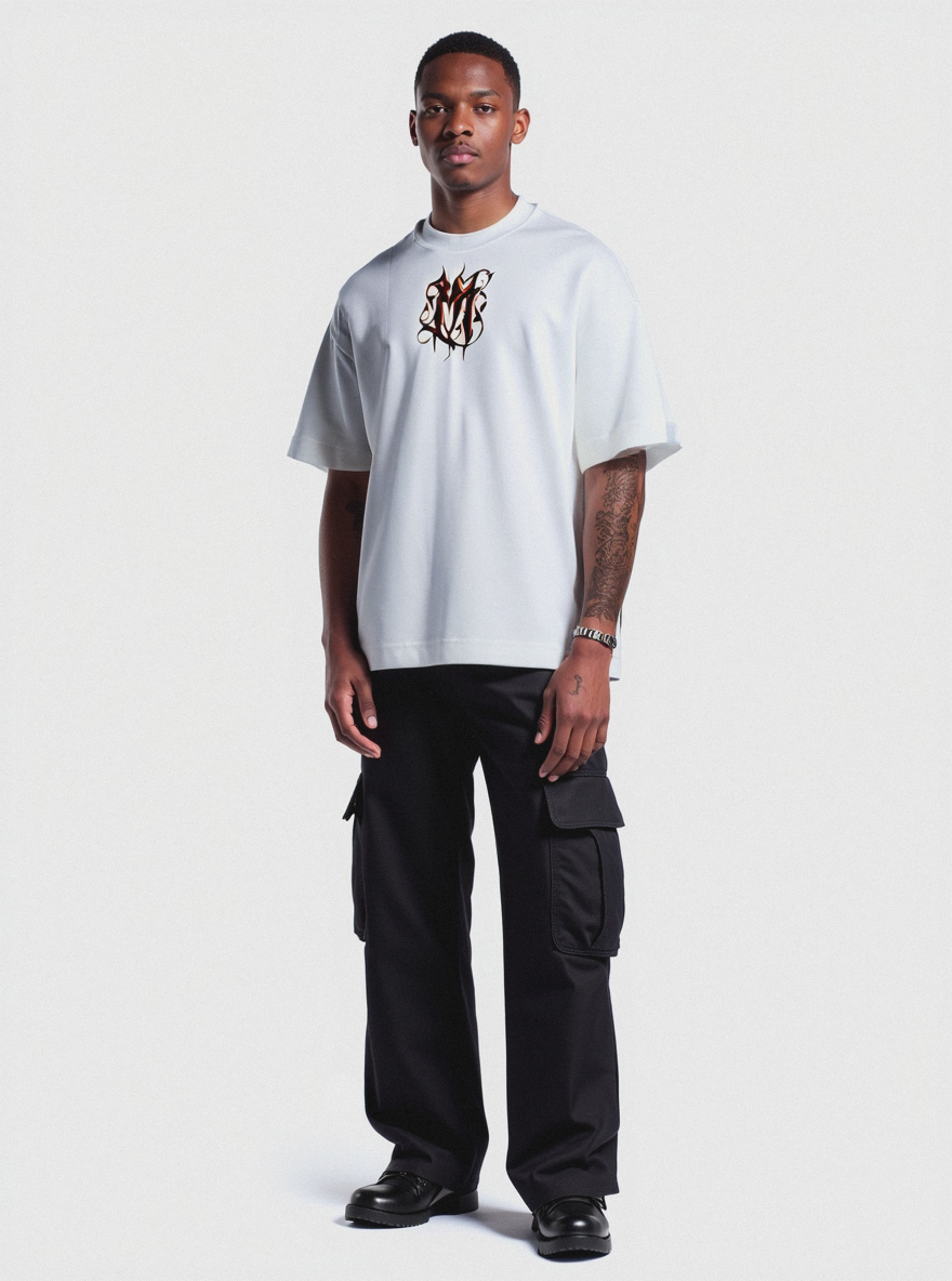 Minimalist, knee-up shot, African American male model with rich, deep brown skin tone, glowing with warmth and radiance, detailed skin texture, high cheekbones, full lips, and a well-defined jawline. Confident and firm posture, standing front-facing, right hand in pockets, legs straight, head facing forward, serious facial expression, closed face, no smile. Wearing (white oversized t-shirt, chest logo, loose fit, untucked), (black wide-leg cargo pants, straight fit, large functional side pockets, clean seams, modern urban silhouette). Plain white studio background, contemporary streetwear look, photorealistic fashion photography, high detail, professional studio lighting, sharp focus on the full outfit, shot on Canon R5, Vogue photoshoot, unedited, raw, DSC_02.jpg, National Geographic, 2019 / Nikon D3400, 50mm, f/2.8.