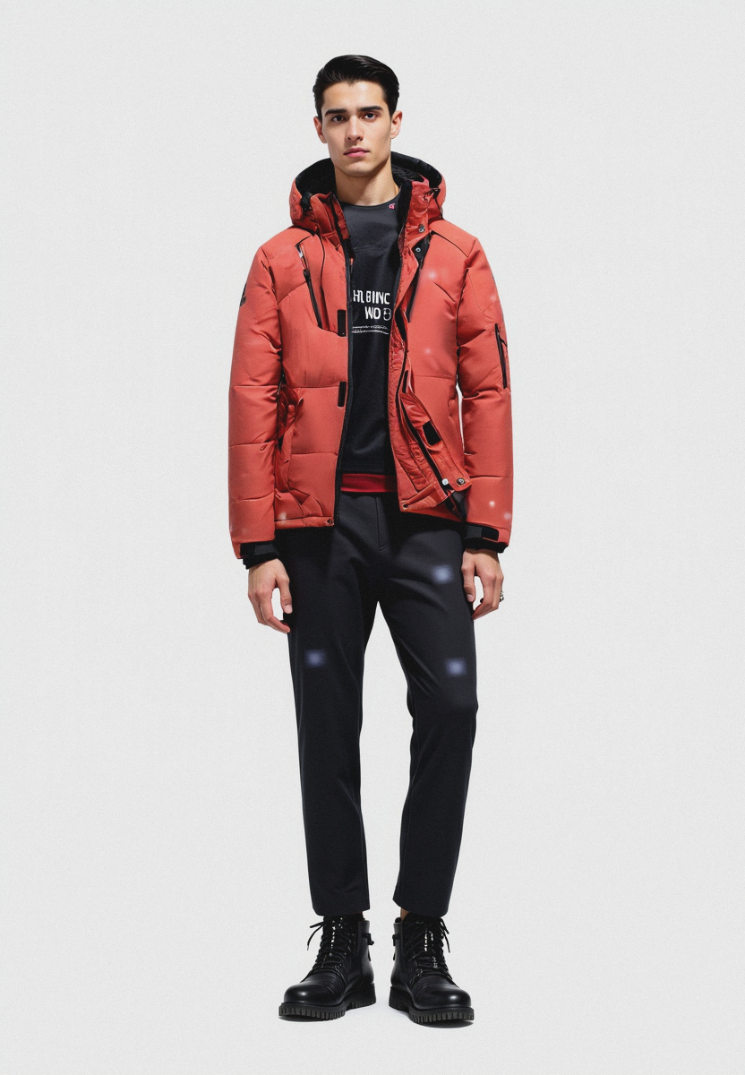 Minimalist, full-body shot, adult Middle Eastern male model with deep, expressive almond-shaped eyes, thick, well-defined eyebrows, high cheekbones, and a strong yet elegant jawline, dark, rich, sleek hair. Standing straight with arms straight down, legs slightly apart, head held in a neutral position. Wearing (red hooded winter jacket, insulated, zip-up style, regular fit), (black straight-leg thermal pants, water-resistant fabric), (black winter boots, lace-up, rugged sole). Plain white studio background, clean and distraction-free. Detailed skin texture, shot on Canon R5, Vogue photoshoot, unedited, raw, DSC_02.jpg, National Geographic, 2019 / Nikon D3400, 50mm, f/2.8.