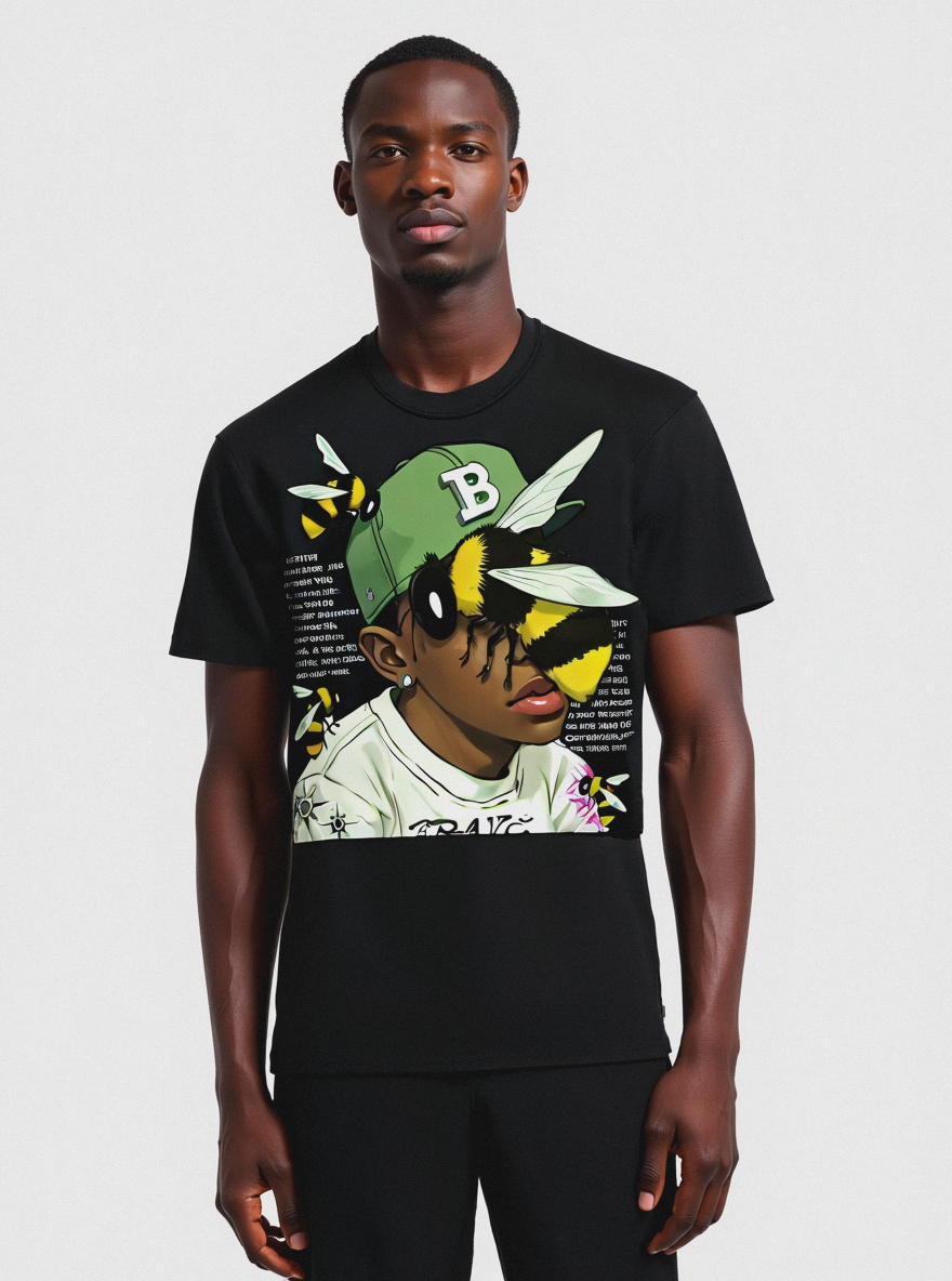 Minimalist, portrait style, adult African American male model, rich deep brown skin tone glowing with warmth and radiance, high cheekbones, full lips, well-defined jawline. Standing front-facing with arms relaxed at sides, legs straight, head forward. Wearing (black graphic t-shirt with bees, regular fit). Plain white studio background, crisp lighting, high contrast, clean and modern aesthetic, focus on facial features and upper garment. Detailed skin texture, shot on Canon R5, Vogue photoshoot, unedited, raw, DSC_02.jpg, National Geographic, 2019 / Nikon D3400, 50mm, f/2.8.