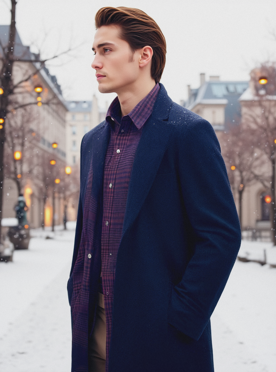 Lifestyle, portrait style, adult Western European male model with chestnut brown straight hair styled elegantly, fair skin with cool undertones, detailed skin texture, high cheekbones, and a defined jawline. Left side view, head turned left, arms relaxed, legs straight. Wearing (red navy plaid button-up shirt, regular fit, collar slightly popped, top button undone), (dark gray wool scarf, loosely draped), (navy blue wool coat, open front, visible shirt underneath), evoking a sophisticated winter style. Background: a quiet European city street in winter, softly falling snow, elegant buildings dusted with frost, snow-covered rooftops, warm glowing streetlights, and bare trees. The sky is soft gray, providing diffused natural lighting. Shallow depth of field keeps the focus on the model while creating a cinematic seasonal atmosphere. Người đàn ông nghiêm túc đang ngước nhìn thành phố. Shot on Canon R5, Vogue photoshoot, unedited, raw, DSC_02.jpg, National Geographic, 2019 / Nikon D3400, 50mm, f/2.8.
