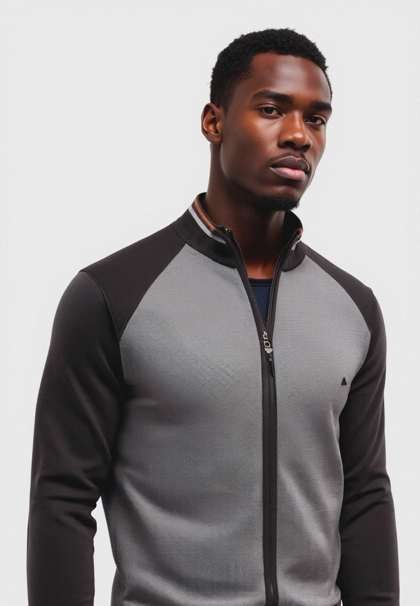 Minimalist portrait, male model, African American, rich deep brown skin tone glowing with warmth and radiance, high cheekbones, full lips, well-defined jawline, head slightly tilted right, looking to camera, arms straight down. Wearing (gray black zip-up jacket, high collar, sleek design, soft texture, regular fit). Studio background, crisp lighting, sharp focus, high contrast. Detailed skin texture, shot on Canon R5, Vogue photoshoot, unedited, raw, DSC_02.jpg, National Geographic, 2019 / Nikon D3400, 50mm, f/2.8.